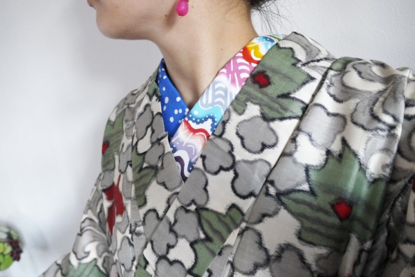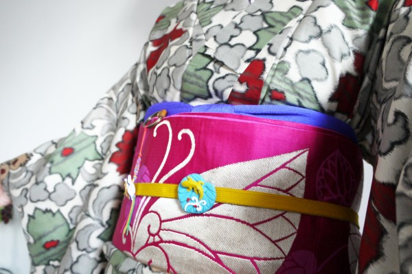 福服さんで買った単衣の銘仙に、ドピンクの葵の蝶帯で。