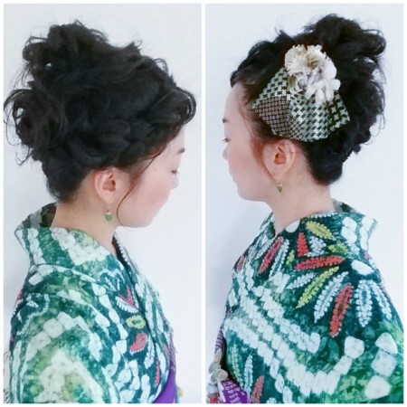 セルフアレンジは、前髪三つ編みで、もしゃもしゃアップ。