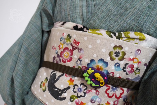 帯は、自作の「市松猫」紅型。