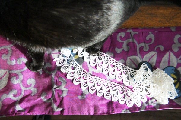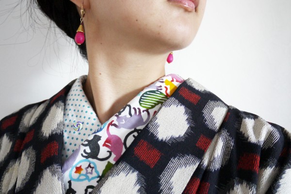半衿は、猫猫猫の紅型に、マメコロンさんの半衿ピンを早速!