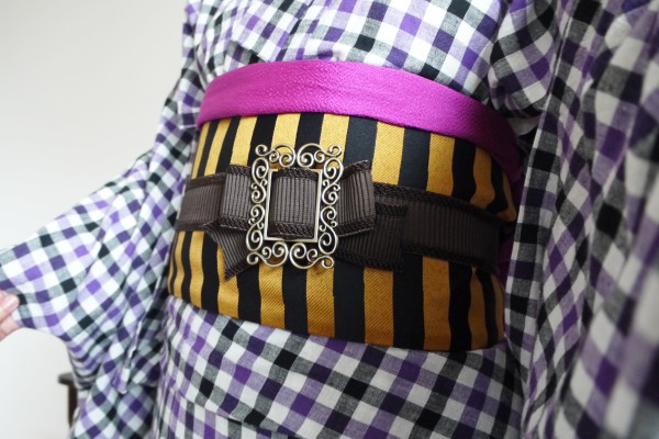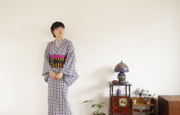 撮影用の袷の着物と、尾長鳥の帯に友人宅でお着替え