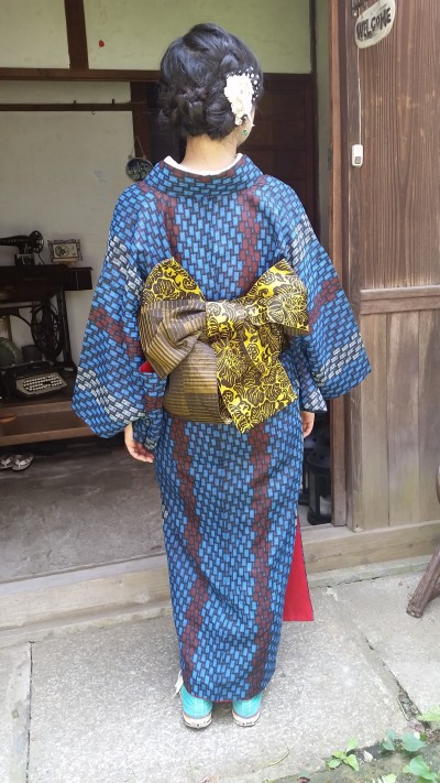 蛇の鱗みたいな着物に、パンチの効いた黄色と黒の半幅帯で。