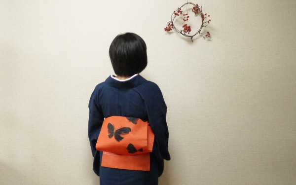 紺のしじらに、オレンジの蝶の夏帯。