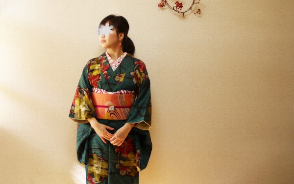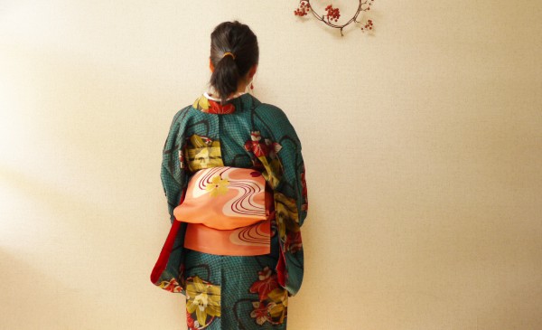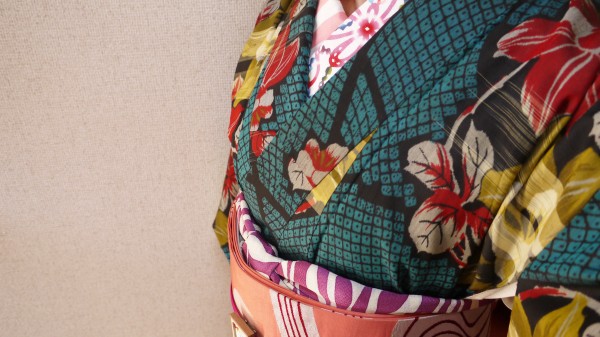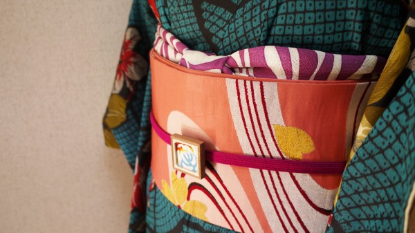 梅まりさんの帯揚げに、桐箱作家さんとのコラボの紅型帯留め「薔薇」