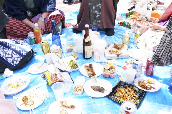 それぞれ持ち寄りで、お酒やおつまみをつまんで。