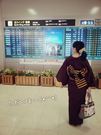 行きは、おばあちゃんにもらったウールに半幅帯で。